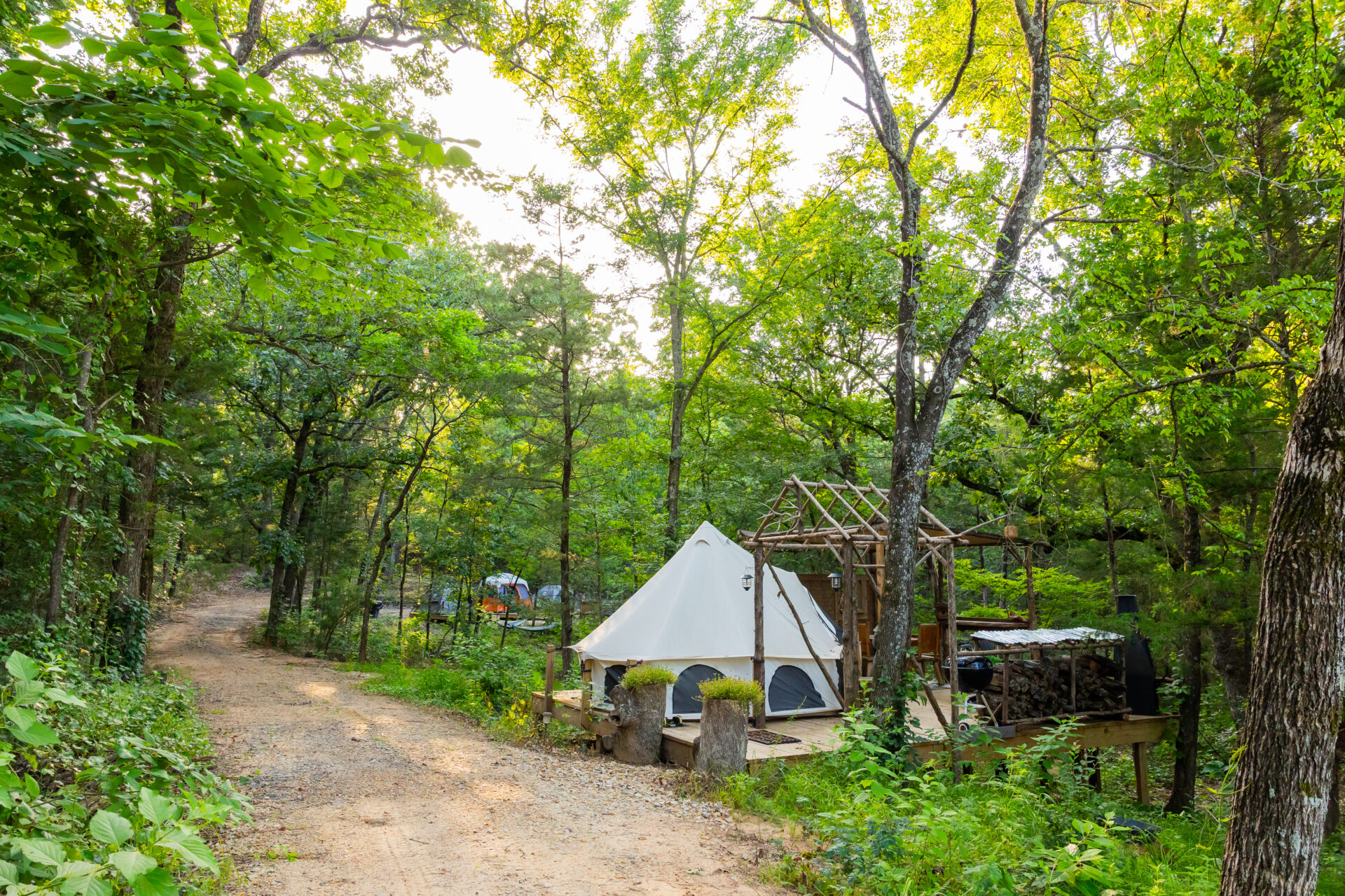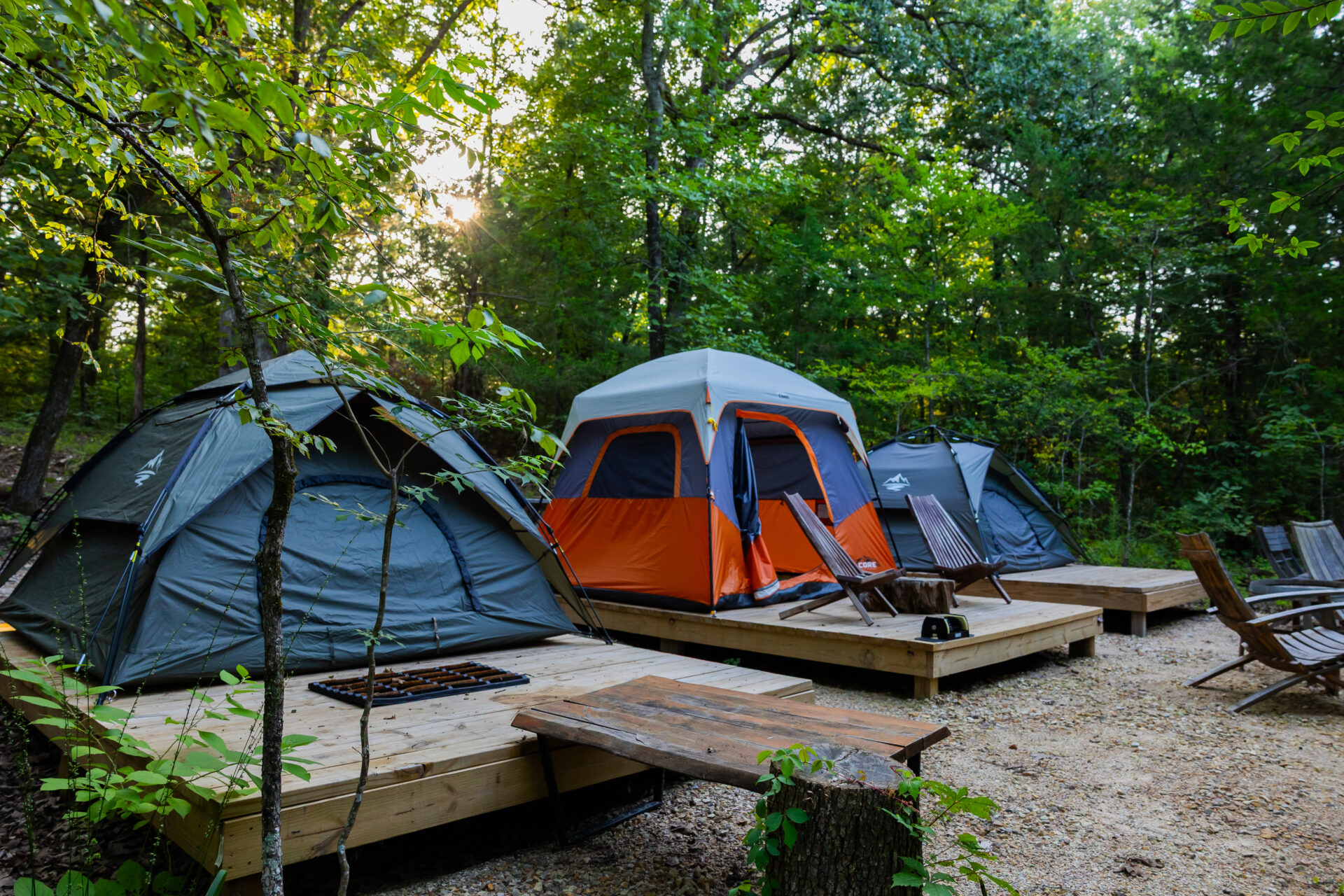 Camp Together, Your Way. Three 2-person tents on private decks with a shared firepit, picnic and dining area, BBQ, and plenty of firewood. Simple comforts, fresh air, and room for everyone.
