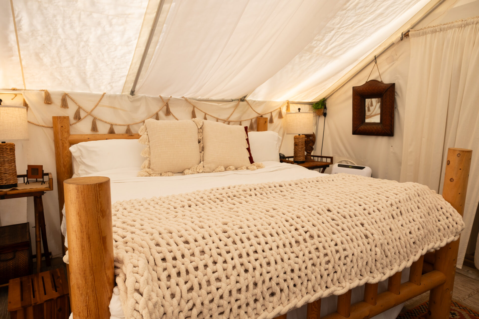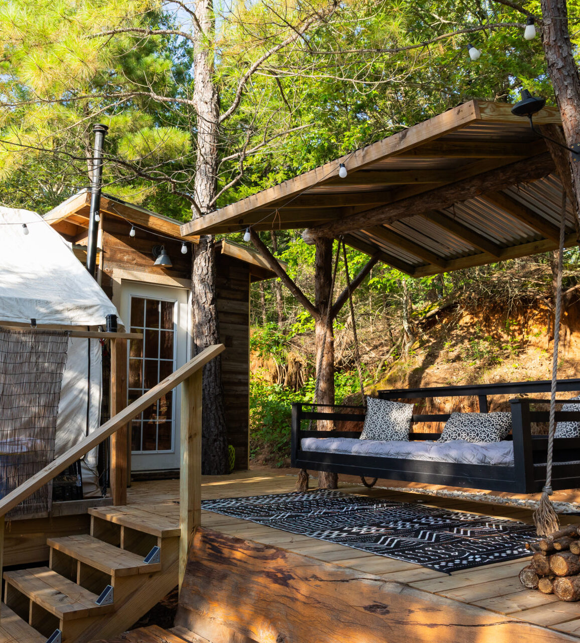Cozy Bell Tent Escape. Unwind in a 13’ canvas retreat with a queen bed, kitchenette, heating & cooling, and a shaded deck with oak bar top. Outdoors, enjoy a chimenea firepit, Adirondack chairs, BBQ, and plenty of firewood.