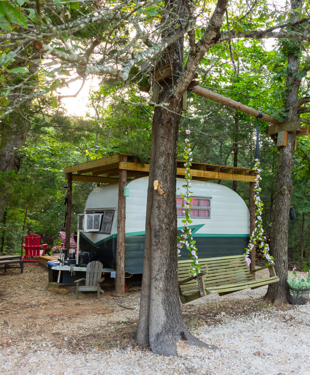 Step Back in Time. This colorful 50s-style vintage trailer sleeps two (plus bunk hammocks for kids), with a cozy kitchenette, A/C and heat, deck seating, firepit, and even a swinging bench out front. Retro charm meets modern comfort.