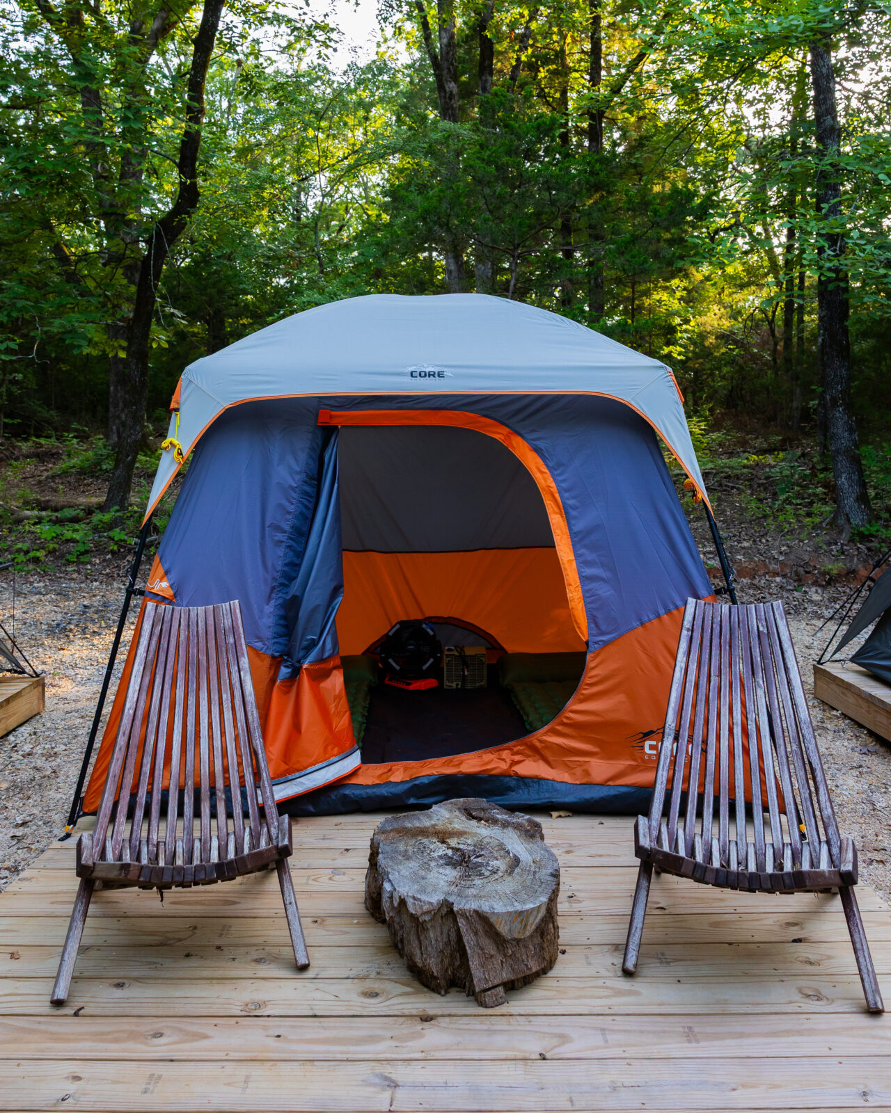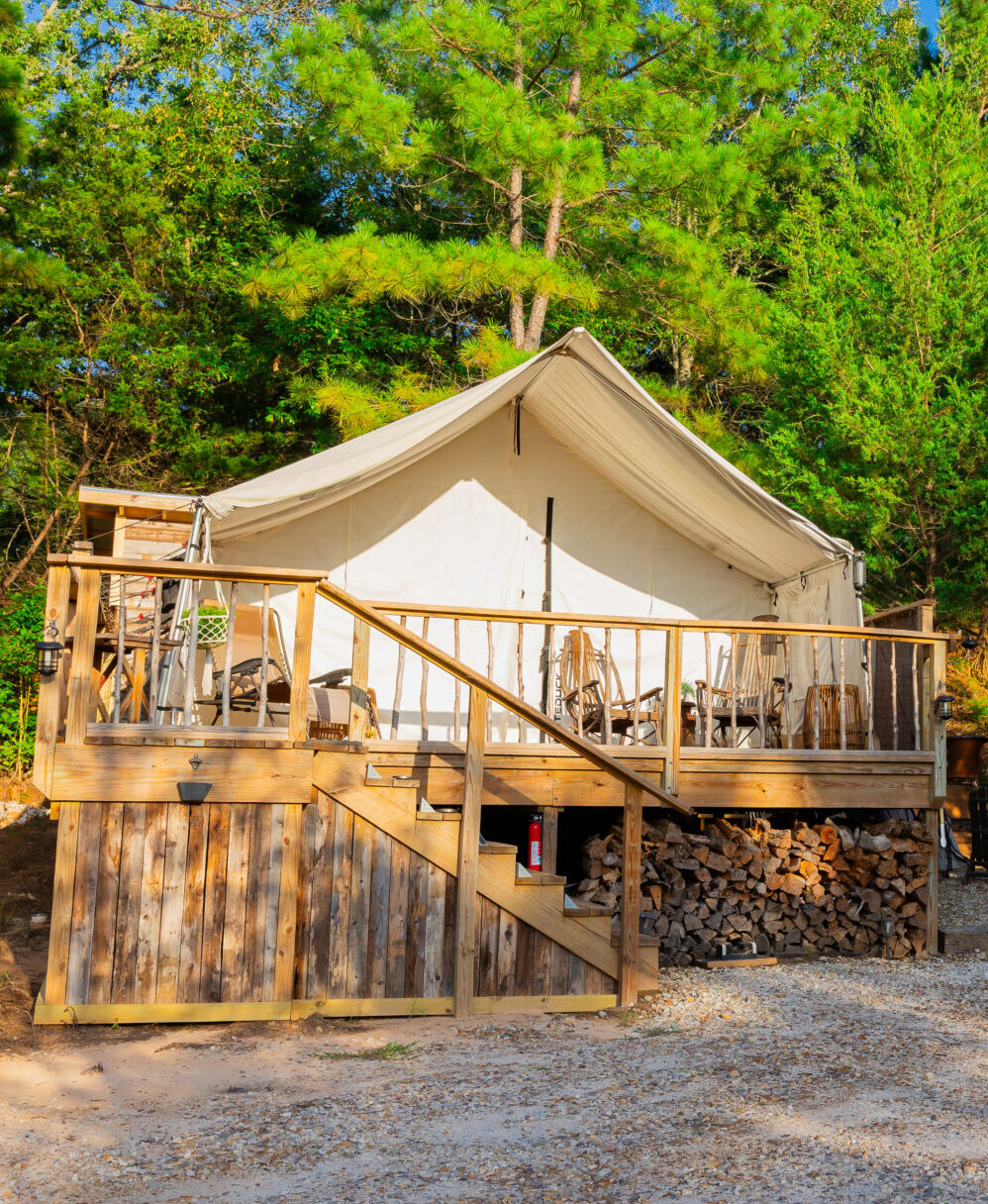 3 camping tents rented as a package. Includes 3, 2-man tents on 3 separate decks. The area includes a firepit, outdoor ice chest, a picnic table with an additional table and 4 chairs for dining. Brita water purification system for drinking water. Firewood provided. Minimal power available with one extension cord. Along with the firepit there is a charcoal barbeque, and charcoal is provided.