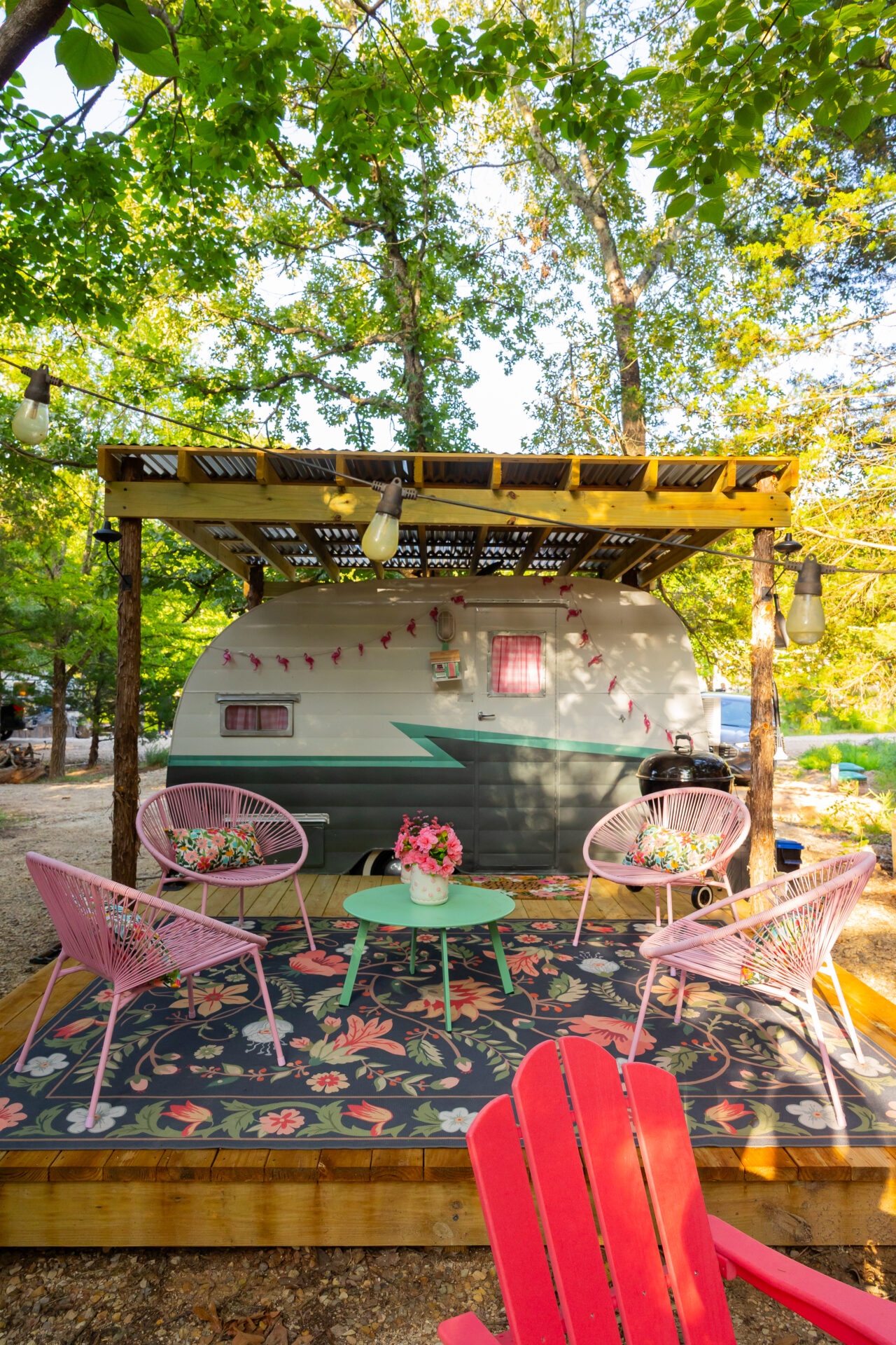 Vintage trailer decorated in a colorful 50s vibe. Interior includes microwave, refrigerator and a hot plate. Small kitchenette with the basic utensils. Brita water purification system for drinking water. Sleeping will accommodate 2 adults with the option of 2 smaller children sleeping in the bunk hammocks. Also features an air conditioning unit and a small electric heater. Includes deck with 4 chairs and a table for seating, a picnic table and a firepit area with 4 Adirondack chairs. Firewood provided. A beautifully decorated swinging bench in front. Outdoor ice chest.