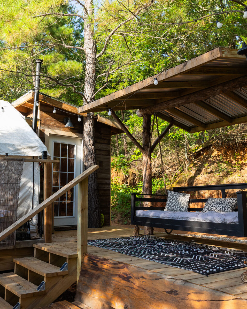 A 14’x16’ safari style tent that includes a very comfortable king-sized bed, a small kitchenette with refrigerator, wood pellet stove for heating and a portable A/C unit with a separate fan for cooling. On the back of the tent is a custom-built bathroom that includes a tile shower, flushing toilet and hot/cold water sink. Brita water purification system for drinking water. There is an armoire for linens and towels. Next to the tent you will see a large firepit area that consists of 4 Adirondack, a custom-made oak bench with a custom-made oak bar top area. Along with the firepit there is a Weber charcoal barbeque, and charcoal is provided. Plenty of firewood at your disposal around the perimeter of the tent. There is a copper clawfoot tub for outdoor bathing and cooling off. On the back deck you will find a swinging daybed with a custom cedar cover. Outdoor ice chest provided.